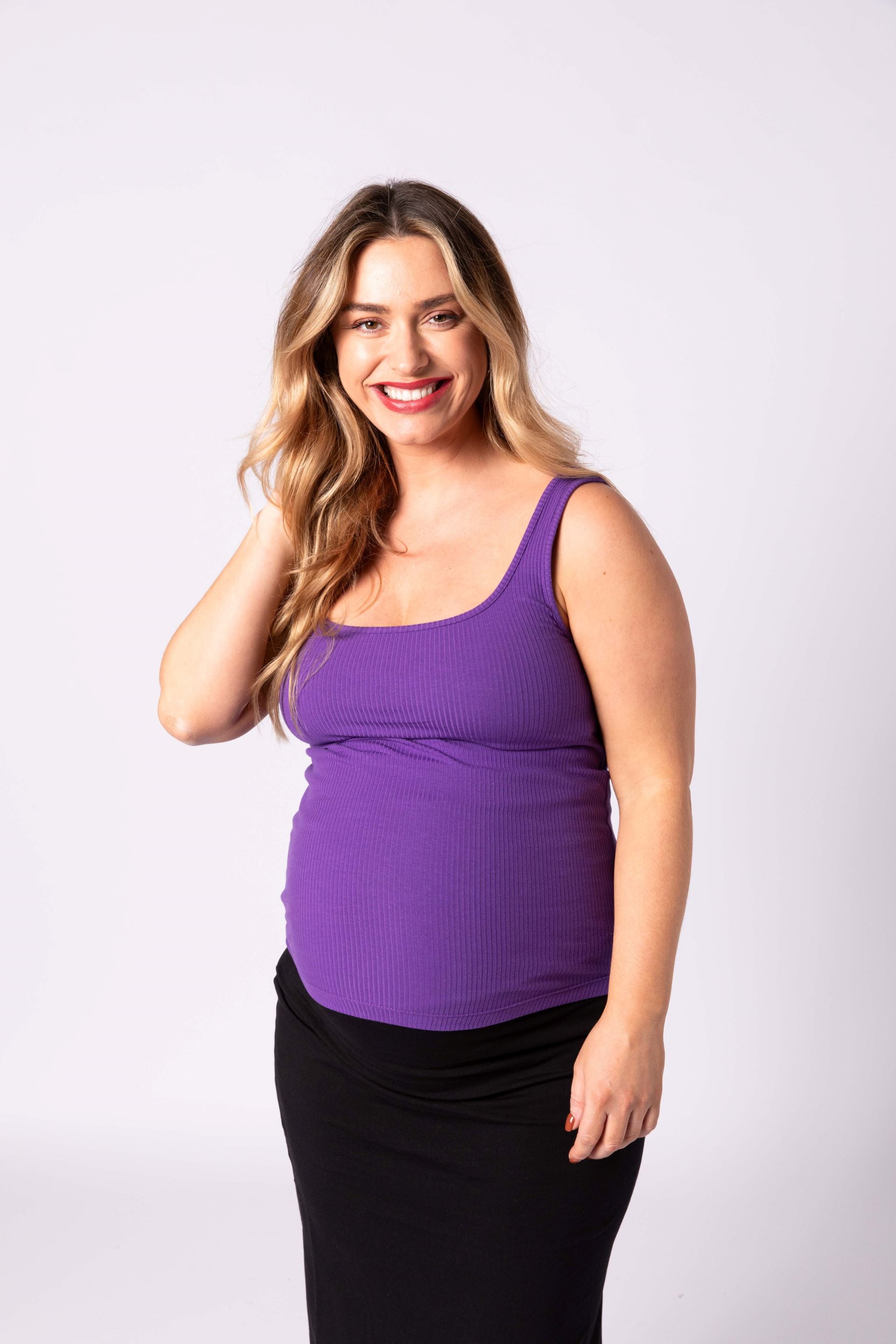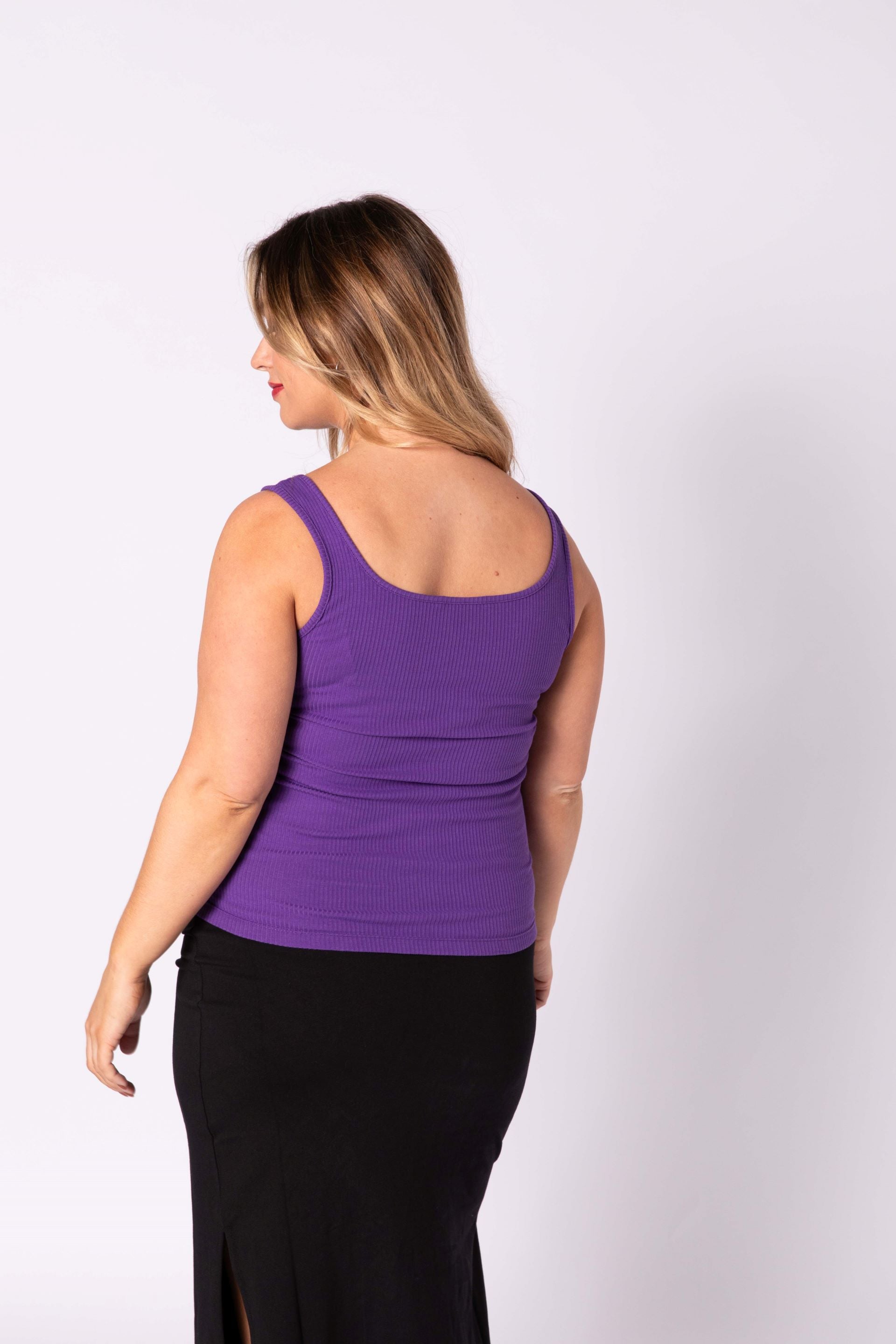 The Aida tank top is made from a soft ribbed cotton-elastane blend, offering comfort and stretch. Its ribbed texture creates a flattering silhouette, and the wide scoop neckline adds a feminine touch, perfect for layering or wearing on its own. This trio includes two versatile colours: Purple and Charcoal